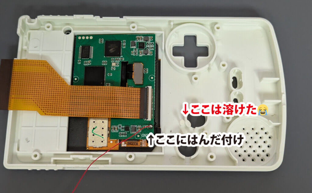 そして、赤い線を取り付けようとしてシェルの一部を溶かしてしまいました…。赤い線は基盤の「BAT」に取り付けましょう。このはんだが溶けにくい!追いはんだがおすすめ。