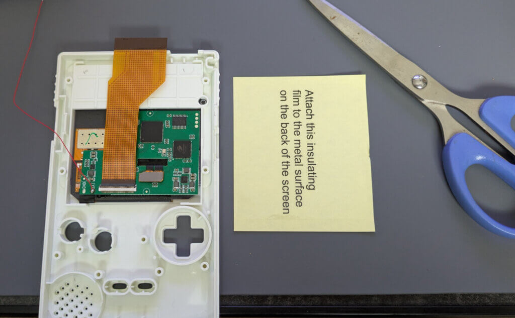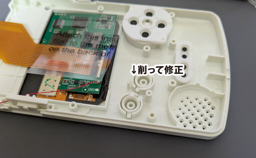 ディスプレイの基盤とメイン基板が接触しないように付属の保護シールを貼っておきます。わかりにくいけど透明のシールです。