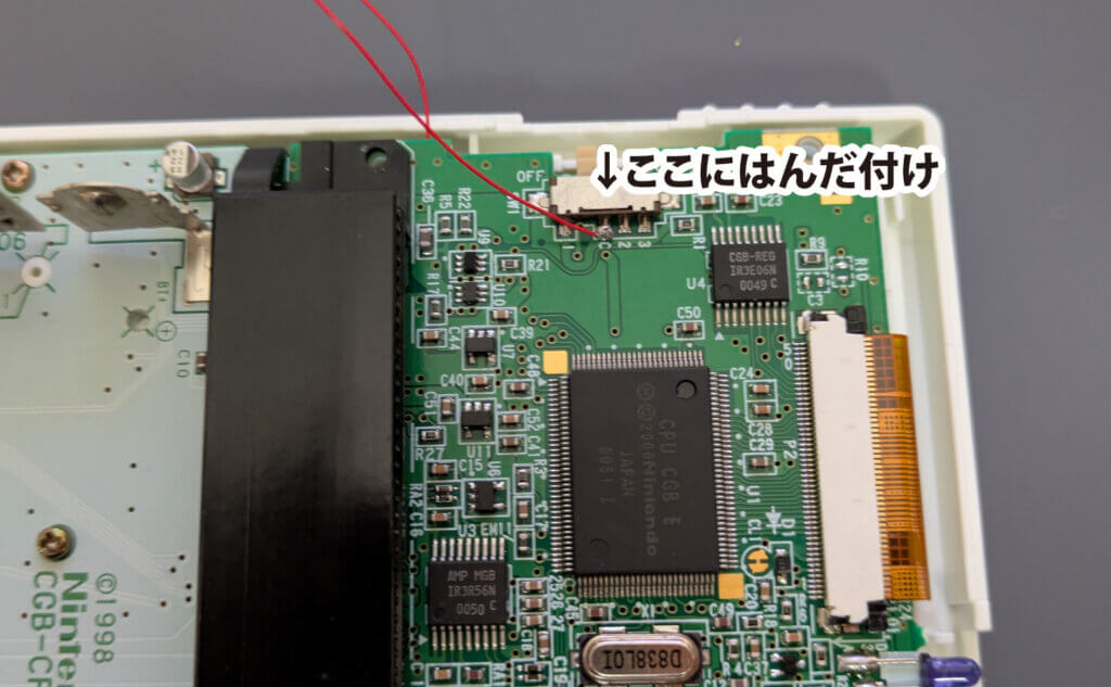 ディスプレイから引っ張ってきた赤い線は、スイッチ部の「0」にはんだ付けします。ここも少し追いはんだしました。