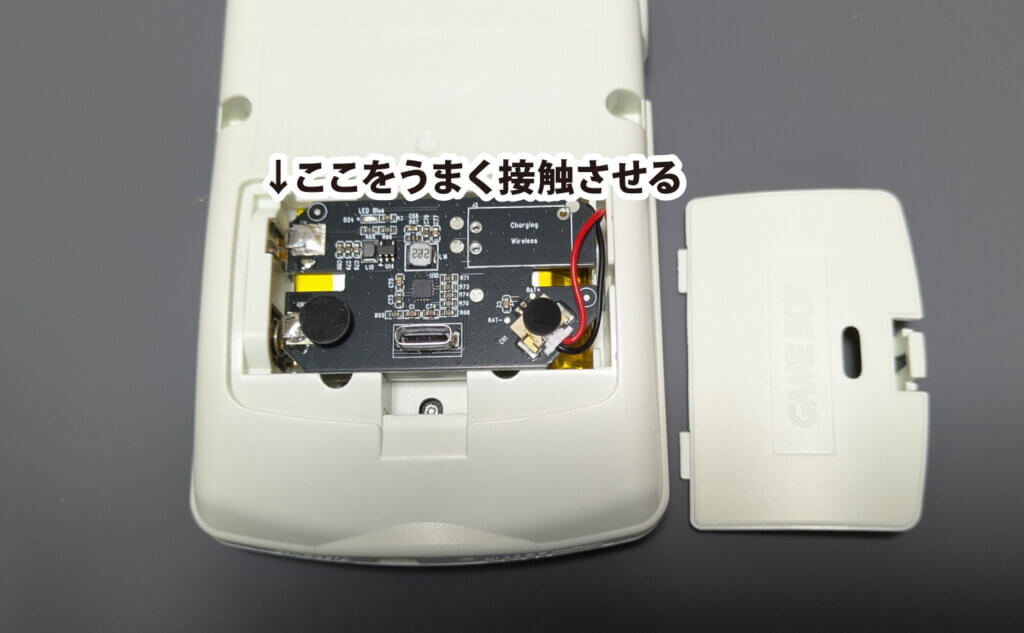 右側の端子は邪魔なので外します。というか最初は外れています。左下はバネがあるので、問題なく端子が接触しますが、左上は基盤の端子をいい感じに伸ばしたりして接触させましょう。