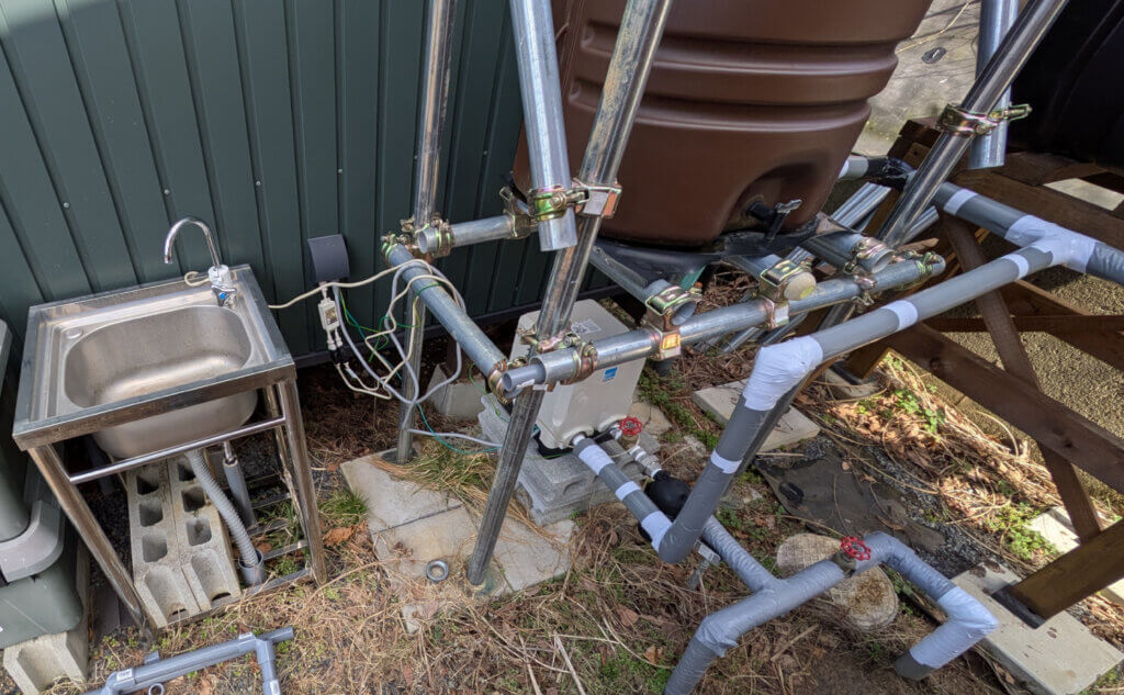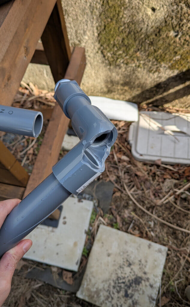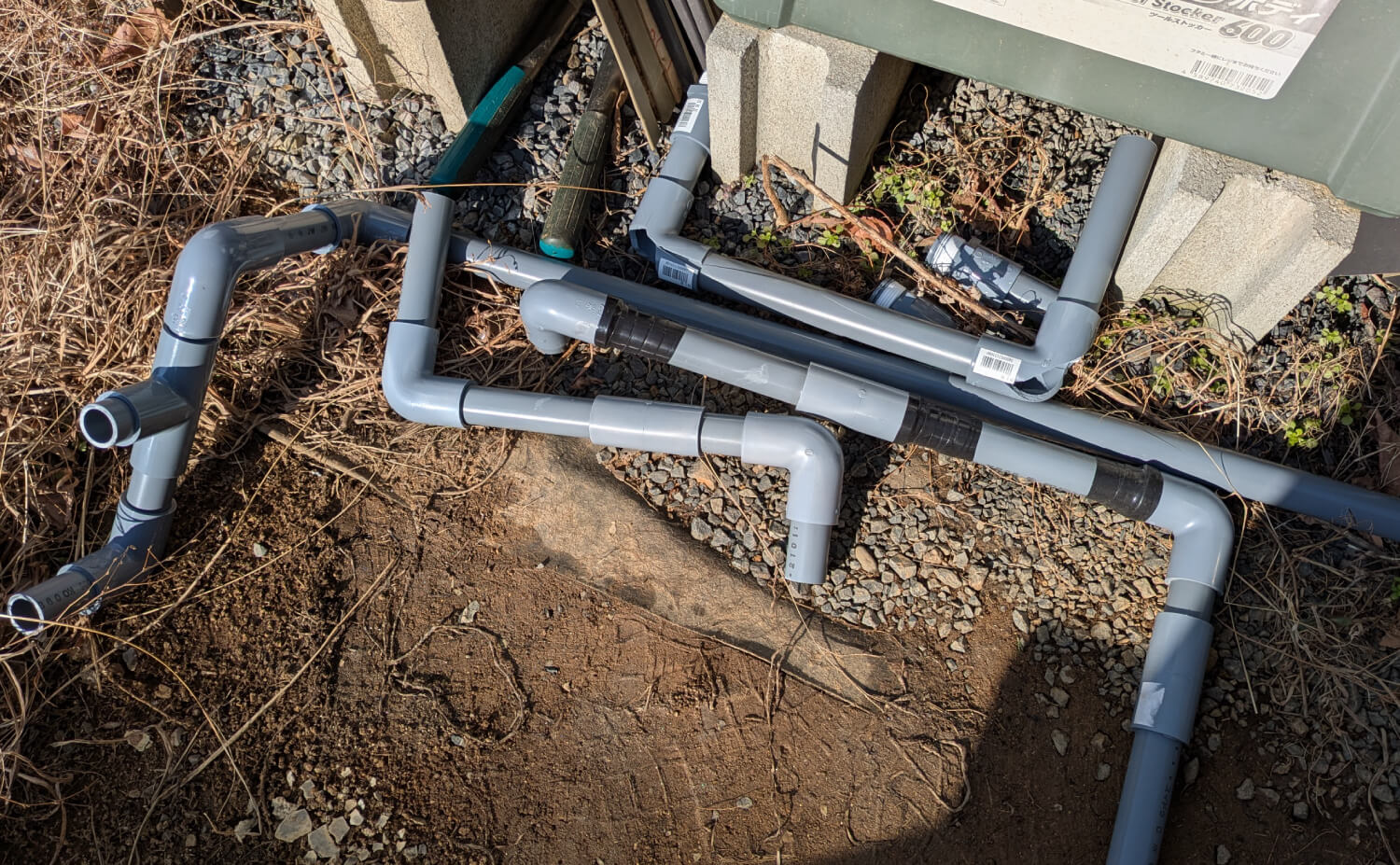 塩ビ管の途中に水がたまらないように勾配に気を付けつつ、サクッと繋げる。とりあえず準備はオーケーということで。